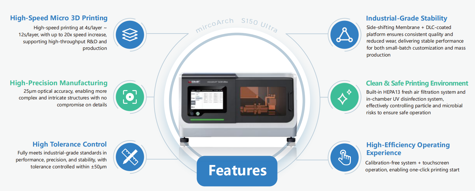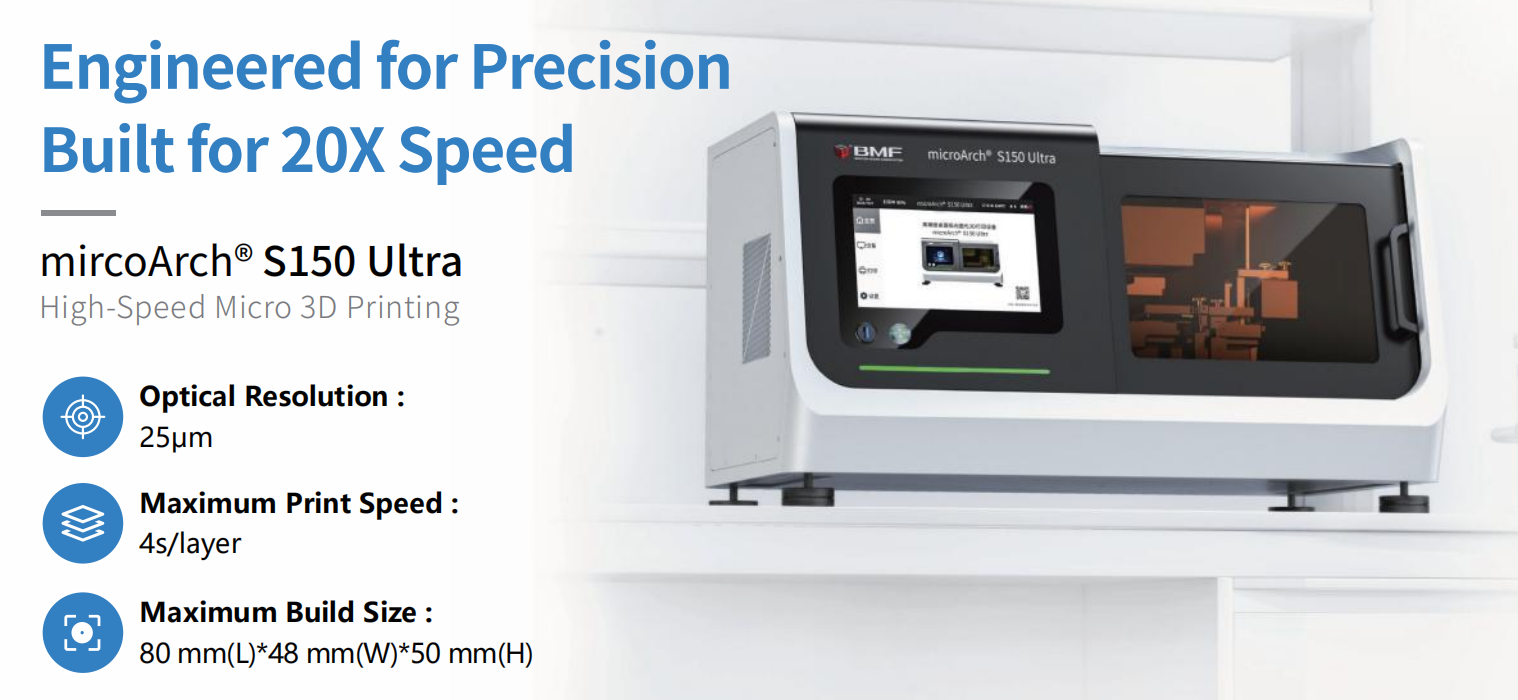 From precision electronics and microfluidics to micro-robotics and biomedical devices, the microArch® S150 Ultra is not just a high-precision 3D printer, it is a high-speed innovation platform.
